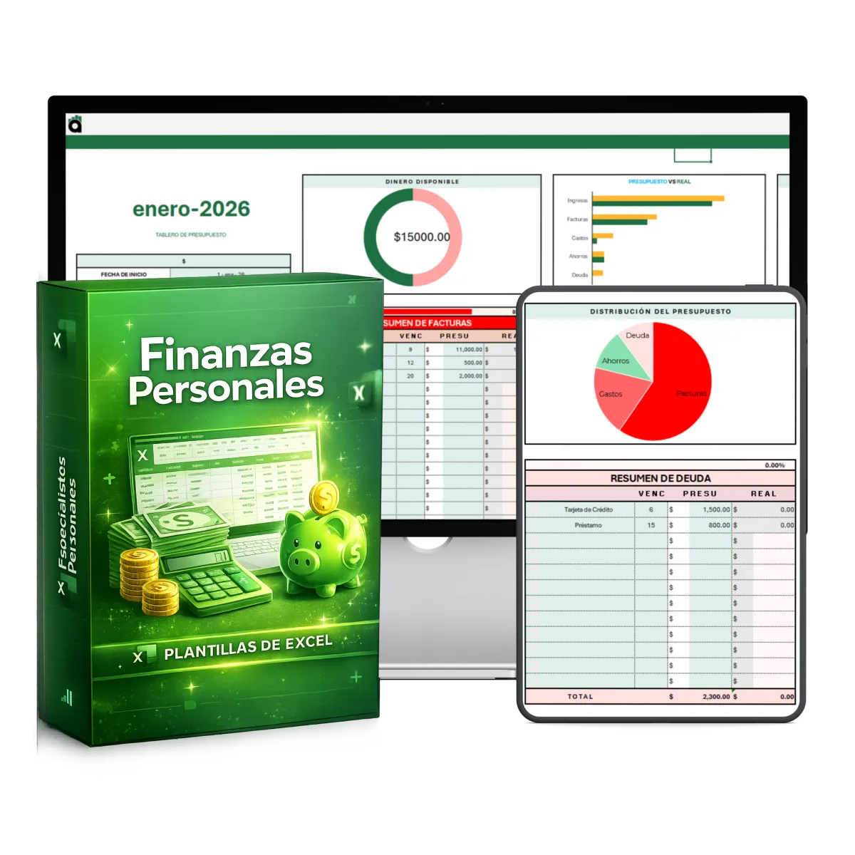Lleva control total de tus ingresos, gastos y ahorro en un solo lugar. Se actualiza sola con fórmulas y te muestra resúmenes claros para que sepas exactamente en qué se va tu dinero y cómo mejorar tu balance mes a mes.